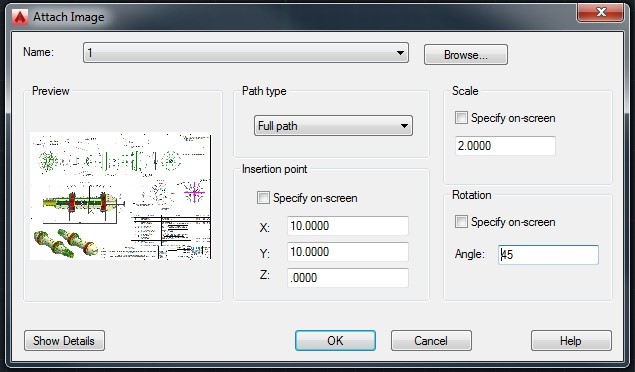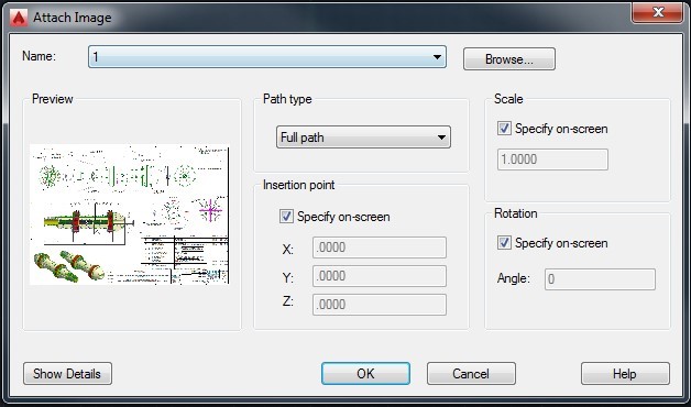 الخطوة الخامسة – بعد التصفح ستظهر نافذة منبثقة تسأل عن نوع المسار ونقطة الإدراج والمقياس وتدوير الصورة التي تحتاجها، حدد نوع المسار كاملاً واضغط على موافق لجميع الخيارات الأخرى مثل “تحديد على الشاشة”، بهذه الطريقة يمكنك إدراج صورتك في أي موضع في نافذة (Auto CAD).