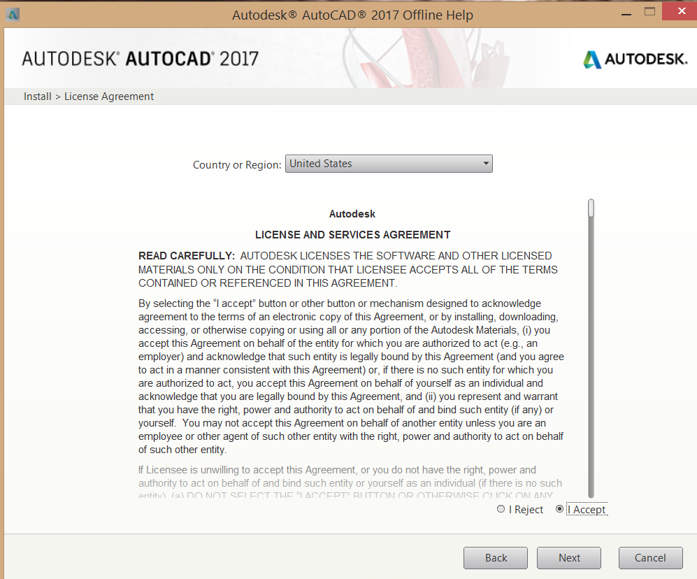 بعد ذلك سترى موجه “اتفاقية الترخيص والخدمات”، اقرأها بعناية ثم انقر فوق خيار “أوافق” ثم انقر فوق الزر التالي لتثبيت (AutoCAD) على نظام (Windows) الخاص بك .