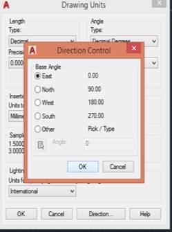 الخطوة الثاني عشر: الآن هناك علامة تبويب أخرى في الطرف السفلي من مربع الحوار هذا: الاتجاه، حيث يجب النقر فوق علامة التبويب هذه، وعند النقر فوق علامة التبويب هذه سيتم فتح مربع حوار لاختيار اتجاه زاوية القاعدة. كما يمكنك اختيار اتجاه زاوية القاعدة من هذا المربع، على سبيل المثال إذا اخترت “الشرق” فستبدأ زاوية القاعدة من 0 درجة أو إذا اخترت “الشمال” فستبدأ الزاوية الأساسية من 90 درجة، حتى تتمكن من اختيار أي شخص وفقًا لمتطلبات الرسم الخاصة بك من هذه القائمة ثم اضغط على الزر Ok في هذا المربع.